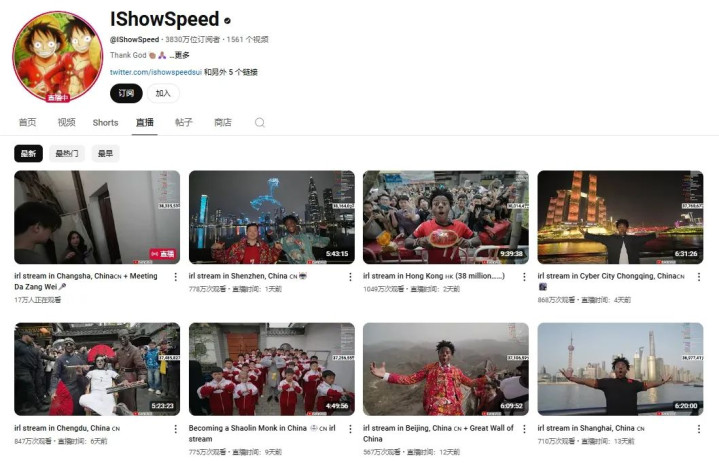 作为全球顶流网红,20岁的“甲亢哥”在YouTube上的账号IShowSpeed拥有3800多万粉丝。他本名达伦·贾森·沃特金斯(DarrenWatkinsJr.),因为直播时表情夸张、比较亢奋,他被中国粉丝称为“甲亢哥”。 至于他和大张伟的缘分,还要从歌曲《阳光彩虹小白马》说起。 因歌词中的“内个内个”与英语中带有歧义的词语发音相似,“甲亢哥”在一次直播中听到后情绪激动,其夸张反应成为网络“整活”名场面。不过误会化解后,他爱上了这首歌,反复在直播间播《阳光彩虹小白马》,也让这首歌在海外意外走红。 特种兵式打卡中国 今年3月,“甲亢哥”开启中国行,先后打卡上海、北京、河南、四川、重庆等地,无剪辑、无剧本地“发疯式Citywalk”全程直播,掀起全网狂欢。 由于关注他的人绝大多数都是外国网友,通过他的镜头,大家也跟着沉浸式感受中国的人间烟火。 在上海武康路,“甲亢哥”与遛狗阿姨闲聊,和街头路人合唱《阳光彩虹小白马》;在北京胡同,他体验煎饼摊扫码支付;在河南登封少林寺,他一招一式学功夫累出“痛苦面具”…… 他一镜到底的直播里,展现的是中国当下的真实生活面貌,很多大家习以为常的中国科技,让海外网友连连惊叹。 在时速350公里的高铁隧道中,“甲亢哥”全程2K高清直播,几乎没有卡顿,有网友惊呼,“我在纽约地铁刷不出文字,他却在中国2K直播,这波属实降维打击。” 截至目前,“甲亢哥”中国行7场直播在YouTube的累计观看人次已突破5500万,发布在ins的短视频中,少林寺单条点赞已突破1134万。 2022年开始,“甲亢哥”在全球边走边播,已经打卡了大约25个国家,而他在中国的直播视频,是所有国家直播里播放量最高的。